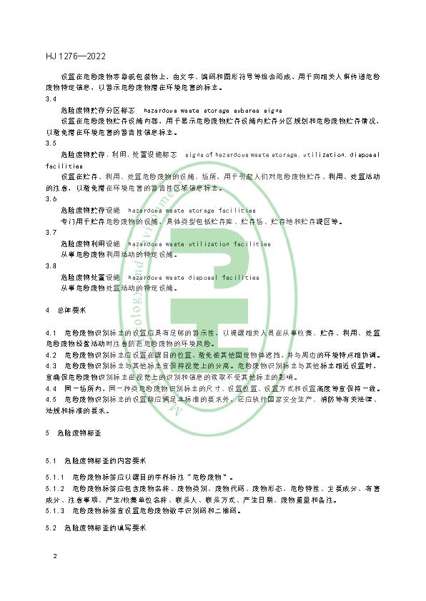 為貫徹《中華人民共和國環境保護法》《中華人民共和國固體廢物污染環境防治法》等法律法規,防治環境污染,改善生態環境質量,規范危險廢物識別標志設置,制定本標準。本標準規定了產生、收集、貯存、利用、處置危險廢物單位需設置的危險廢物識別標志的分類、內容要求、設置要求和制作方法。本標準的附錄A 為規范性附錄,附錄B 為資料性附錄。本標準為首次發布。