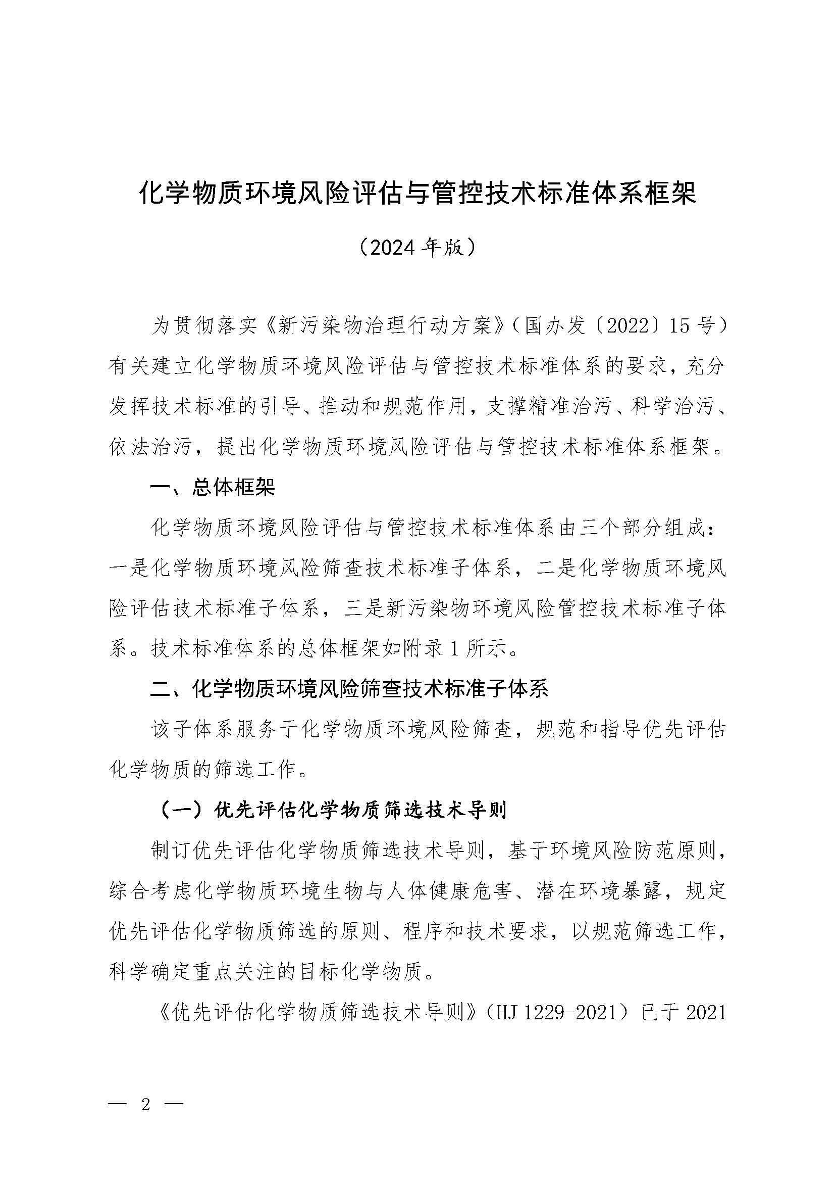 為貫徹落實(shí)《新污染物治理行動(dòng)方案》(國(guó)辦發(fā)〔2022〕15號(hào))有關(guān)建立化學(xué)物質(zhì)環(huán)境風(fēng)險(xiǎn)評(píng)估與管控技術(shù)標(biāo)準(zhǔn)體系的要求,充分發(fā)揮技術(shù)標(biāo)準(zhǔn)的引導(dǎo)、推動(dòng)和規(guī)范作用,支撐精準(zhǔn)治污、科學(xué)治污、依法治污,我部組織編制了《化學(xué)物質(zhì)環(huán)境風(fēng)險(xiǎn)評(píng)估與管控技術(shù)標(biāo)準(zhǔn)體系框架(2024年版)》?,F(xiàn)印發(fā)給你們,供開(kāi)展化學(xué)物質(zhì)環(huán)境風(fēng)險(xiǎn)評(píng)估與管控等工作參考??赊D(zhuǎn)發(fā)給有關(guān)技術(shù)單位,開(kāi)展標(biāo)準(zhǔn)制修訂預(yù)研究工作。
