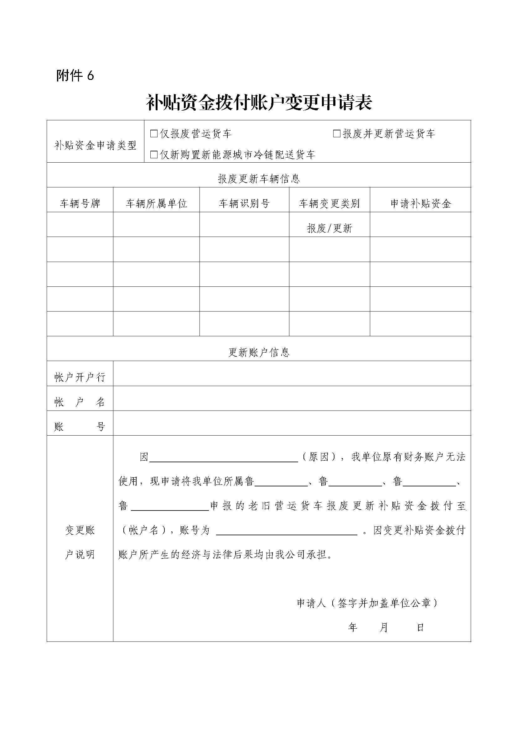 (2)對(duì)于車主單位銀行基本賬戶因被查封或其他原因?qū)е沦~戶無(wú)法正常使用的,車主單位可出具補(bǔ)貼資金撥付賬戶變更申請(qǐng)書(附件6,需加蓋單位公章)原件,另行指定補(bǔ)貼資金撥付銀行帳戶。